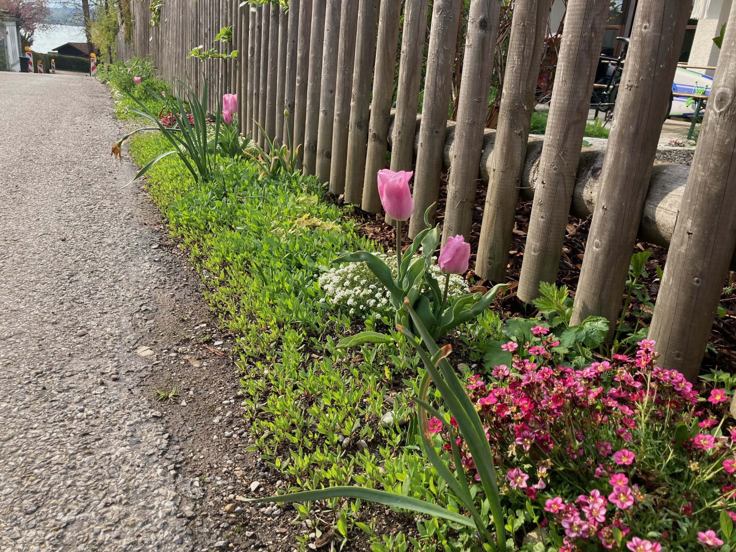 Es gibt in Steinebach einen Weg, an dem man auf nur 10 Metern unser Problem studieren kann. Auf der einen Seite ein Jahr für Jahr mit unglaublicher Liebe und Passion gepflegter Wegrand, der blüht und gedeiht und mit kleinen Hölzchen, Stöckchen und Schnüren gegen trampelnde Mitbürger oder ihre überbreiten SUVs geschützt wird. Dazu der klassische hölzerne Hanichelzaun, ein Insignium des bayerischen Bauerngartens.