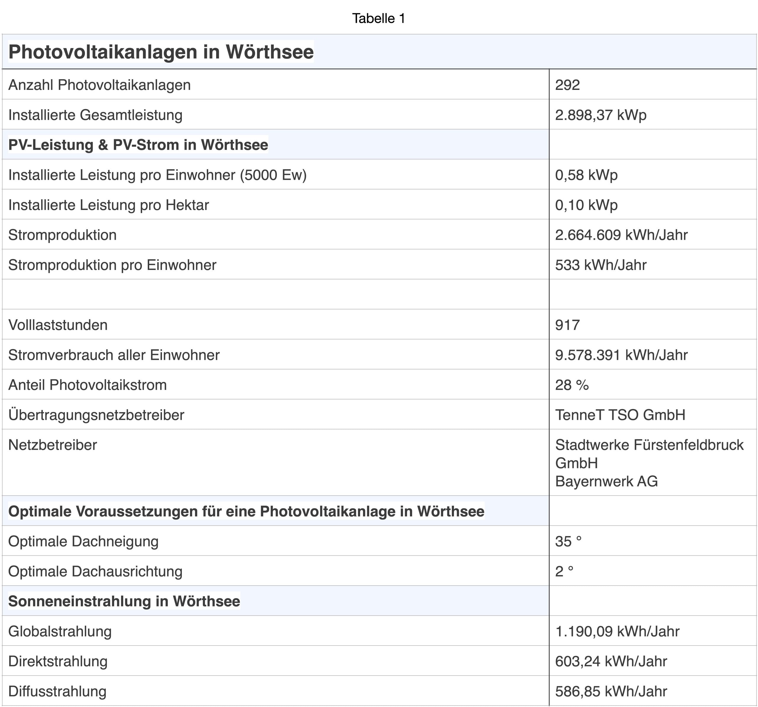 PV Anlagen in Wörthsee 2021. Eigene Zusammenstellung nach Bundesnetzagentur und „Rechnerphotovoltaik.de„