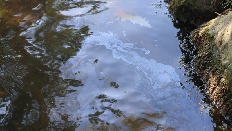Auch nach über einem Jahr nach dem Ölunfall tritt aus dem Seeboden bei Störung Öl aus. Foto (10.9.2025): Stephan Bleek.